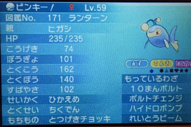 ほぼほぼパチリスで決定だったんだけど、パーティーバランス的に水タイプが欲しかったのでランターンに。